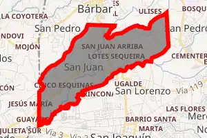 It has the lowest elevation of the canton. It is directly south of the municipality of Santa Bárbara de Heredia, divided into two main neighborhoods: San Juan Arriba (Upper San Juan), and San Juan Abajo (Lower San Juan). In addition, there are other neighborhoods: Cinco Esquinas (Five Points), Villa Margarita, Tierra Santa (Holy Land), Calle Zapote (Zapote Street), and several developments.[11] Routes 123 and 119 pass through San Juan.[11][19]