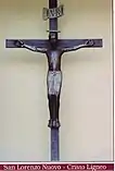 The 34-metre (112 ft) height parish church of San Lorenzo Martire dominates Piazza Europa. Surrounded by numerous ex-voto, a crucifix is kept in its fine chapel. It is a 12th-century Byzantine statue made of polychrome wood. On 12 October 1778 it was escorted in a solemn procession from the old village to the new church. The crucifix has been venerated ever since.