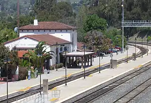 San Luis Obispo station is a passenger rail station in the city of San Luis Obispo, California, United States. The station is fully staffed with ticketing and checked baggage services.[5] The present Spanish Colonial Revival architecture style depot was built by the Southern Pacific Railroad and opened on September 5, 1943.[3] It replaced the original SP depot, located just south of the current one, which opened on May 4, 1894. After the present depot opened, the former depot was then used for freight until it was shuttered in 1968. It was demolished to make room for a parking lot in 1971.