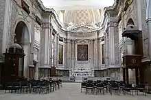 It has a single nave with three chapels on each side. The interior is richly decorated with stucco, though its main features are its 18th-century high altar. The high altarpiece is surmounted by three paintings - Niccolò de Simone's 1654 Saint Potitus pierced by a burning nail making the emperor Antoninus share his pain, flanked by Giacinto Diano's 1784 Saint Potitus felling an idol and Saint Potitus curing the madness of Antoninus' daughter Agnes.[1] Diano also painted a 1791 depiction of the Immaculate Conception in the third chapel on the right, whilst in the first chapel on the right is Luca Giordano's 1663-65 Our Lady of the Rosary. A 17th-century Calvary is in the first chapel on the left, the second chapel on the left has stucco depicting Saint Cajetan and the third chapel on the left has a painting of Our Lady with Saints Antony the Great and Roch by Andrea Vaccaro. The sacristy contains two paintings by Pacecco de Rosa and Domenico Mondo.[2]
