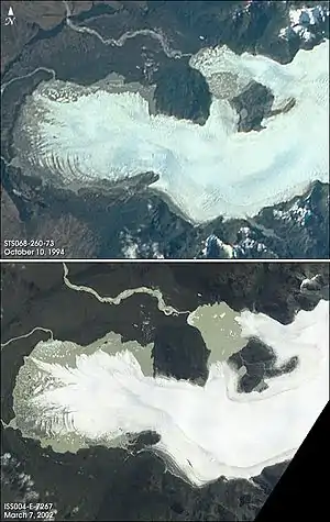 San Rafael Glacier in the foreground and San Quintín Glacier behind, showing change over the interval circa 1990–2000. Both giant glaciers have been retreating rapidly in recent years (BBC story).