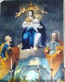 Our Lady is represented on the throne: with an arm she is holding the Christ Child, who is stretching out his hands towards her, while her right hand is holding a heart; on the two sides there are Saint Peter, with a book and keys in his hands, and Paul the Apostle (or saint John the Apostle) with a book and a lily. Below them we can see a bridge, which recalls the old one on the river Jato that is near this place.
