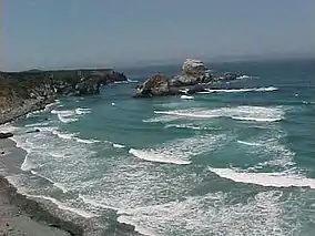 There is a .25 miles (0.40 km) access trail through a row of Monterey pines to a trail running along the top of a grassy bluff. There are views along the seaside bluff with long views up and down the coast. The beach is about .5 miles (0.80 km) long and longer at low tide. It is popular with hikers and photographers due to its breathtaking bluffs. A steep 120 feet (37 m) trail leads from the bluff to a wooden staircase that descends the final 40 feet (12 m) down to the beach.[3] A short trail to the south leads to an overlook guarded by a wooden railing. It is possible to see whales migrating along the coast during certain parts of the year.[3][4] A large white sea stack named Plaskett Rock is visible, offshore from Plaskett Rock Point, the headland that separates Sand Dollar Beach from Jade Cove. Cone Peak in the Santa Lucia Mountains is visible to the northeast.[3]