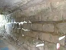 The base and lower half of the culvert is constructed of poor quality grayish sandstone to a height of approximately 1 metre (3 ft 3 in). These sandstone blocks are heavily weathered as a result of water erosion. The curved roof is made of fired red bricks built in two overlapping layers. Both the sandstone and upper brick structures feature lime mortar, which is in poor condition and is crumbling.[1]