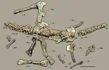 Sanjuansaurus was comparable in size to a medium-sized Herrerasaurus, with a thigh bone that was 395 millimetres (15.6 in) long and a tibia that is 360 millimetres (14 in) in length (in the description paper the tibia is listed with 260 mm in length due to a typo).[1] Alcober and Martinez performed a phylogenetic analysis and found Sanjuansaurus to be a herrerasaurid.[1] It was determined that Sanjuansaurus and Herrerasaurus share many similarities in the morphology of the skull, neck vertebrae, back vertebrae, hip vertebrae, scapula, and the hip bones. Alcober and Martinez observed that Sanjuansaurus and Staurikosaurus share many similarities in the morphology of the hip bones, and the tibia.[1] The pubis of Sanjuansaurus, unlike in other herrerasaurids, points toward the cranium.