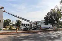 As of 2014, Santa Barbara County has 3 aerial ladder trucks 1 front line located at Station 11 as well as an auxiliary ladder truck. The second truck is located at Station 30 in Solvang. The truck weighs 74,000 pounds (34,000 kg) and features a 100-foot (30 m) ladder and a pump that produces 1,250 GPM. The pump is connected to a nozzle at the top of the ladder allow water to be sprayed onto a fire from above. Besides being set up for fire fighting, the truck is also configured for technical, trench and confined space rescue. Along with the standard ladders and hoses, the truck also carries cutting torches, chainsaws, ropes, air bags and various other tools. The truck automatically responds to all technical rescues, vehicle accidents and structure fires in Battalion 1.[8]