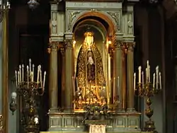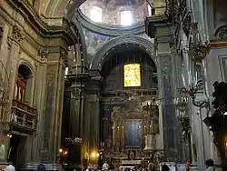 The dome has an artificial vanishing point painted by Giordano, which makes it look more slender. The chapel of Our Lady of Sorrows has a much revered statue. The Church is the historic seat of the Military Order of the Most Holy Saviour and St. Bridget of Sweden