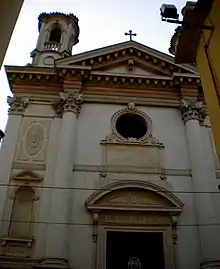 The church arose adjacent to the oratory of Sant Croce or Sala del Redentore. Documents from 1181 state a chapel at the site, adjacent to a leprosarium, was dedicated to the Holy Cross. The church became a parish in 1308. In 1606, the parish came under the rule of the Somaschi Fathers, who established a school at this site. The commission to build the present Rococo style church was given to a lay brother of the order, Francesco Vecelli (1695–1759). Construction began in 1737 and was completed in 1749. Under Napoleonic rule, the Somaschi were expelled and the church came under control of secular clergy. The belltower was built in 1907.