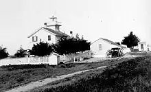 The original lighthouse was one of a number of California coastal lights allocated funding by Congress in 1850, only 19 days after statehood.[11] Because of disputes over ownership of the land, construction did not proceed until 1868.[12] The original light was a two-story wooden structure, with a lantern housing a fifth-order fresnel lens. Erosion of Point Santa Cruz required the lighthouse to be moved back 300 feet (91 m) in 1879.