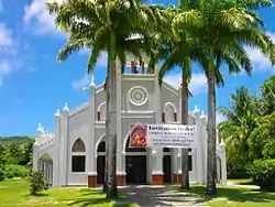 The church was inaugurated and dedicated to the Virgen de los Remedios (Our Lady of Remedies or locally: Nuestra Senora Bithen de los Remedios)[3] officially in October 1958, following the Roman or Latin rite and depends on the Diocese of Chalan Kanoa (Dioecesis Vialembensis) which was created in 1984 by Pope John Paul II by Properamus bull. Its entrance is adorned with palm trees and gardens. The building was renovated in 1995 and rededicated on the feast of "Santa Remedios".[4]