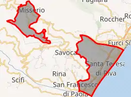 Santa Teresa di Riva (Sicilian: Santa Tresa di Riva) is a small town and comune in the Metropolitan City of Messina, Sicily, southern Italy, located about 15 kilometres (9 mi) from Taormina. The town was known until 1854 as Marina di Savoca when it was renamed in honor of Teresa d'Austria. The town is neighbored to the northeast by the towns of Furci Siculo and Roccalumera, to the west by Savoca, and to the southwest by Sant'Alessio Siculo and the mountainous Forza d'Agrò.