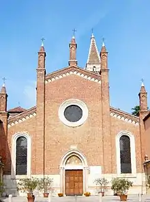 Construction began on October 13, 1464 and was completed two years later, on April 6, 1466. An inscription inside records the consecration on February 14, 1483. The bell-tower was built in 1550. The presbytery was elongated. The choir was frescoed by Paolo Farinati. In 1688, the elliptical sacristy was built. Among the highly decorated chapels, there are works by Montagna, Badile, Palma il Giovane, Mocetto, Morone, Brusasorci, Farinati and others, whilst Veronese's The Feast in the House of Simon the Pharisee originally gung in the monastery refectory.