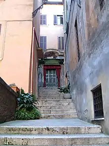 The building lies in rione Ponte, at the top of Monte Giordano, an artificial hill located southeast of Ponte Sant'Angelo. It came into being in the Roman era, created from the rubble produced by the nearby Harbour of the Marbles on the Tiber.[1] It can be reached by a staircase which is part of Via di San Simone, a side lane of Via dei Coronari overlooking the south side of the church of San Salvatore in Lauro. The church could once also be accessed on the southwest side, from Via della Vetrina.
