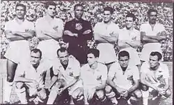 Between the 1917 and 1926 seasons, Santos was recognized as a solid and talented team, but one that could not offer a true challenge for the state title, finishing no higher than fourth place.[20] That changed in 1927 when the tradition of the Alvinegro became defined during the 1920s: the discovery and creation of young talent. The team, known as O ataque dos 100 gols (English: The 100-goal attackers), was led by the first major club idol, Araken Patusca, son of the first president of Santos. With the Araken Patusca was the first Santista to participate in a World Cup, as a member of the Brazilian national team squad in the FIFA World Cup in 1930, the first World Cup. He played one match against Yugoslavia.[21] Santos finished as runners-up in 1927, 1928 and 1929, scoring 100 goals in 16 games in the 1927 season, resulting in an incredible rate of 6.25 goals per match. The milestone of 100 goals was a result of work characteristics that later would become an excerpt in the official anthem of the club: Técnica e Disciplina (English: Technique and Discipline). Santos entered a period of irregular campaigns, coinciding with the club's transition to professionalism; in 1933 the president of Santos publicly declared Santos a professional side for the first time. This was followed by the club's first great success in 1935.[15] During that season, the club prepared heavily for the Paulistão with 14 friendlies, winning seven, losing four and drawing three matches. The 10-1 thrashing of Espanha at the hands of Santos provided the highlight of its preseason preparations. On the last match of the state competition, Santos defeated Corinthians 2–0 at the Estádio Parque São Jorge, Corinthians' home ground at the time, to win their first state title ever, thanks to goals by Raul and an experienced Araken Patusca. This historic consecration sealed Santos' first major title and paved the way for future generations to follow.[15]