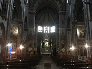 The church's origins date back to January 1905, when it was blessed and inaugurated by the then Bishop of Verona Bartolomeo Bacilieri. The building was left incomplete (with only perimeter walls, no plaster, a rough ceiling and a concrete floor) until 1922 to 1923, when devotion to St Therese of the Child Jesus began to spread. The Gothic style church is presented in rare splendour with polychrome marbles, sculptures, mosaics, windows, paintings and decorations. On the large wall behind the façade is a fresco by Ugo Bargellini of Florence, which depicts the apotheosis of the Carmelite, with details of Saint Therese of the Child Jesus. 220 figures are depicted across 144 m² of wall.