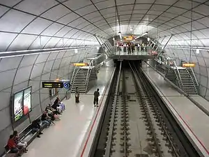 Peñota station follows the typical cavern-shaped layout of most underground Metro Bilbao stations designed by Norman Foster, with the main hall located directly above the rail tracks.