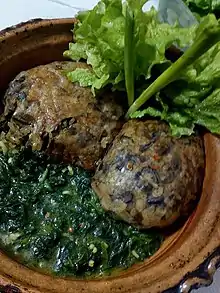 A grapevine leaf roll is a dish consisting of cooked grape-vine leaves wrapped around a variety of fillings. Stuffed vine leaves without meat are sometimes called yalancı dolma, which means "liar's dolma" in Turkish.[6] Vişneli yalancı dolması is a variation of stuffed vine leaves where the rice is seasoned with cinnamon, allspice and mint. The dolmas are slowly cooked together with morello cherries (vişne), and plums may be used also.[7]