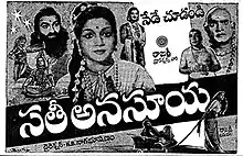 Sati Anasuya is a 1957 Telugu-language Hindu mythological film, based on the life of Anasuya, produced by Sundarlal Nehata under the Rajyasri Productions banner and directed by K. B. Nagabhushanam. It stars N. T. Rama Rao, Anjali Devi, and Jamuna with music composed by Ghantasala.