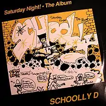Saturday Night! – The Album was first released on Schooly-D Records in 1986.[4][1][13] On the album's Jive Records re-release, it charted on Billboard's Top Black Albums for ten weeks peaking at number 59.[14][15] In the United Kingdom, the album was released by Mute Records affiliate called Rhythm King where it charted on the UK Indie Charts for 10 weeks peaking at number four.[10][16] Singles for the album included "Saturday Night" and "Dedication to All B-Boys" released on Schooly-D Records and Flame Records.[12][16] Both "Saturday Night" and "Dedication to All B-Boys" appeared on the UK Indie Charts."[16] On its release, Philadelphia's city officials had the album removed from store shelves after public outrage over the violent content in the songs.[17]