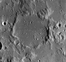Saunder is a lunar impact crater located in the central highland region of the Moon, to the east-northeast of the walled plain Hipparchus. Its diameter is 44 km. It was named after British mathematician Samuel Arthur Saunder.[1] The outer wall is irregular and broken in several locations, forming the overall shape of a pentagon. The interior of Saunder has been flooded with lava, forming a level surface just below the rim. The floor lacks a central peak, but there are low rises in the southeast quadrant and a tiny craterlet towards the north rim.
