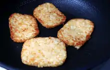 A savoury pattie is a battered and deep fried mashed potato, seasoned with sage. It is commonly sold in the British port towns of Hartlepool, Kingston upon Hull, Wirral, Liverpool, North Tyneside, Kirkwall and Thurso and subsequently Troon after the arrival of Jill Rosie.[1] It is a popular item in fish and chip shops, and is consumed either as a snack or as an inexpensive substitute for fish in a fish and chip meal.[2]