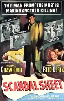 Scandal Sheet is a 1952 American film noir directed by Phil Karlson. The film is based on the novel The Dark Page by Samuel Fuller, who himself was a newspaper reporter before his career in film. The drama features Broderick Crawford, Donna Reed and John Derek.[1]