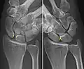 Xray indicates scapholunate ligament instability when the scapholunate distance is more than 3 mm, which is called scapholunate dissociation.[7] A static instability is generally readily visible, but a dynamic scapholunate instability can only be seen radiographically in certain wrist positions or under certain loading conditions, such as when clenching the wrist, or loading the wrist in ulnar deviation.[6]