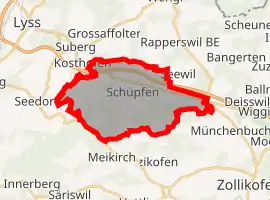Schüpfen has an area of 19.84 km2 (7.66 sq mi).[4] Of this area, 11.05 km2 (4.27 sq mi) or 55.7% is used for agricultural purposes, while 6.52 km2 (2.52 sq mi) or 32.9% is forested. Of the rest of the land, 2.13 km2 (0.82 sq mi) or 10.7% is settled (buildings or roads), 0.08 km2 (20 acres) or 0.4% is either rivers or lakes and 0.02 km2 (4.9 acres) or 0.1% is unproductive land.[5]