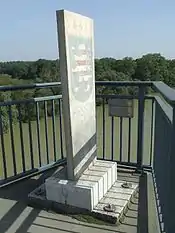 An impressive landmark on the deck of the bridge marks where the bridge crosses the middle of the left arm of Rhine - the border between Rhineland-Palatinate and Hesse. The monument, with the coat of arms of both states, was produced by Raimund Eser in 1961. It was donated by the William Dyckerhoff Institute of Wiesbaden.