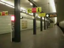 It was built in 1930 by A. Grenander. There was a total damage on 7 May 1944, and it was repaired by 1946. The western entrance was closed in 1959, and only eastern entrance exists. In 2003 the station was renovated again and orange/red panels were attached on the walls.[2]