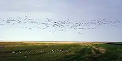 The avifauna of the national park is comparable with avifaunae of other Wadden Sea regions. With over 10 million birds in spring and autumn the trilateral Wadden Sea accommodates the most birds in Europe.[13] The nutrition-rich area is visited by migratory birds regularly. Due to the ongoing changes in the Wadden Sea the effects of the national park on the avifauna are hard to quantify. From 1994 to 2004 only three bird species (European spoonbill, Great cormorant, common ringed plover) increased in number. In the same period, the stock of 18 other species shrank including barnacle goose, common greenshank, Eurasian curlew, black-headed gull, lesser black-backed gull, Eurasian oystercatcher, pied avocet and dark bellied brent goose.[23]