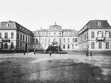 During the French occupation in 1925, the building was confiscated and used as the headquarters of the commandant's office.[3] In 1934, the consistory of the Evangelical Church in the Rhineland moved into the building. However, the existing lease was unlawfully terminated due to considerable pressure from the NSDAP Gauleiter Friedrich Karl Florian in the Gau Düsseldorf, so that on 30 January 1937 the Gauleitung could be established in the building. It sat here until the heavy air raid on 12 June 1943, during which the castle was severely damaged; it then moved to the building of the Oberlandesgericht Düsseldorf. The palace was not rebuilt until 1950 by Helmut Hentrich. Some receptions of the young Federal Republic took place here.
