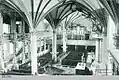 Construction of the Lutheran chapel along the western side of the castle's southern wing began in 1584 under the direction of Blasius Berwart of Stuttgart.[1] Located on the second floor, the single-naved church featured a hall with wooden vaults, stucco, and Dutch-influenced scrollwork.[2] The massive Moskowitersaal (Muscovite Hall) spanned the floor above. In 1594 the church was dedicated by Sebastian Artomedes, pastor of Königsberg Cathedral.[3] Wood rot was discovered in the cellar, however, and from 1602 to 1608 the original wooden base was replaced with a doubly reinforced lierne or stellar vaulting with granite pillars by Hans Wissmar and Timotheus Just, building master of Elbing.[4] After the renovations were completed the now double-naved church contained slim granite pillars and a stellar vault. The first Calvinist sermons in the now double-naved church were held in 1641.[5]