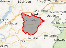 The municipality is located in the Sense district, north-east of Fribourg. It consists of the village of Schmitten, the hamlets of Fillistorf, Lanthen, Ried, Tützenberg, Berg, Burg, Mühletal and Zirkels, along with the farmhouses of Bunziwil, Hohe Zelg, Wiler, Betlehem and Vetterwil.