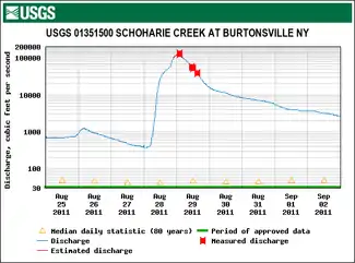 The United States Geological Survey (USGS) maintains many stream gauges along Schoharie Creek. The first station is 1.2 miles (1.9 km) east of Lexington in operation since 1999, had a maximum discharge of 40,500 cubic feet (1,150 m3) per second on August 28, 2011, as Hurricane Irene passed through the area, and a minimum discharge of 4.8 cubic feet (0.14 m3) per second on August 21–22, 2002.[6] Another station by Prattsville in operation since 1902, 0.2 miles (0.32 km) upstream from Schoharie Reservoir, had a maximum discharge of 120,000 cubic feet (3,400 m3) per second on August 28, 2011, with no minimum discharge recorded.[7]