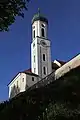 The origin of Schongau is the current Altenstadt (lit.: old town). A large number of the inhabitants moved only a few kilometres into a new settlement founded on the Lech and took the name Schongau with them in the 13th century. The hillside was far better situated to defend it. The town of Schongau is located very close to the former Roman road to Augsburg, Via Claudia Augusta (47 AD) and has its name from the Romans. In the Middle Ages, it was an important hub and an commercial centre on route Verona-Augsburg-Nuremberg and at salt road from Berchtesgadener Land into the Allgäu. Lechrain, populated by the Alemanni, was under the rule of the Swabian Welfs until the 12 century. After the death of Welf VI in 1191, the Welf territories in Swabia changed in to the hands to the Hohenstaufen. Emperor Frederick Barbarossa gave it to the Hohenstaufen. When the last Staufer ruler Conradin had moved to Italy in 1267 to defend his power against Charles of Anjou, his ally Duke Ludwig II of Bavaria unexpectedly denied his help and demanded the payment of debts, which is why Konradin had to give away a large part of his possessions as the Duke of Swabia (called the Konradinian donation).[3] In this way, the Bavarian dukes of Wittelsbach, who were ambitious to extend their influence into the Alamannian settlements up to Lech and came to rule the Lechrain in 1268. Emperor Ludwig the Bavarian had given Schongau the right to mint in 1331.[4] Duke Christoph der Starke liked to stay in the city.[5] Christophstrasse is named after him in the historic centre of the town. On 22 May 1493, a devastating fire destroyed large parts of the Oberstadt (upper town) and the ducal palace; it was not until 1514 that reconstruction was completed.[4][5] Schongau was involved several times in martial conflicts and was often a transit camp of friendly and hostile troops.