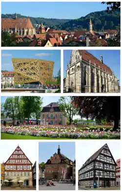 ![]() Clockwise from top: Skyline from Zeiselberg, Heilig Kreuz Münster, Rokokoschlößle, Kornhaus, city hall, Grät, Forum Gold und Silber | |