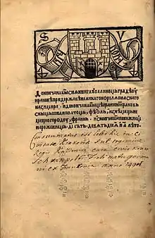 On March 9, 1489, the King of Poland and Grand Duke of Lithuania Casimir issued Fiol the privilege to the invention of a machine for pumping water from mines.[5] The invention has been under interest of a wealthy merchant and banker John Thurzo (1437-1508), who owned a number of mines, including the lead mines in Olkusz. Subsequently, Thurzo, with the Kraków patrician Jan Teshnarom had sponsored Fiol's printing house. To start printing it was necessary to cut out the appropriate Cyrillic script.