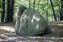 Schwiederstorf's coat of arms shows the glacial erratic Karlstein and the Imperial Crown of the Holy Roman Empire to reference a myth of Charlemagne's interrupted nap during the Saxon Wars. By this legend, Charlemagne took rest at the Karlstein and threatened to kill anyone who dared to wake him up. So his dog was thrown at him to wake him up as the Saxons closed in. As he noticed the danger, he yelled ″So sure as I will split this stone with my sword, so certain we will defeat the Saxons″ swung onto his horse, jumped over the Karlstein and cut it with his sword. His horse and dog also left their marks in the stone. The Saxons where defeated and the 'Ortstein' near Grauen is said to have its reddish color from the bloodstained soil.[7]