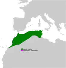 The Berber toad is found in north western Africa, occurring in Morocco eastwards through Algeria into Tunisia, and south to the northernmost part of Western Sahara, although this has yet to be confirmed.[1] An introduced population is also present in Spain close to Los Alcornocales Natural Park in the vicinity of Algeciras.[4]