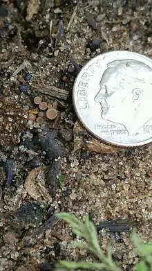 The lifecycle of Sclerotinia sclerotiorum can be described as monocyclic, as there are no secondary inoculums produced. During late summer to early fall, the fungus will produce a survival structure called a sclerotium either on or inside the tissues of a host plant. S. sclerotiorum sclerotia can viable spores for at least three years[9] and germinate to produce fruiting bodies called apothecia, which are small, thin stalks ending with a cup-like structure about 3–6 mm in diameter.[10] The cup of the apothecium is lined with asci, in which the ascospores are contained. When the ascospores are released from the asci, they are carried by the wind until they land on a suitable host. The ascospores of S. sclerotiorum only infect the flower of susceptible hosts [11][10] and begin to invade the host's tissues via mycelium, causing infection. S. sclerotiorum is capable of invading nearly all tissue types including stems, foliage, flowers, fruits, and roots. Eventually white, fluffy mycelium will begin to grow on the surface of the infected tissues. At the end of the growing season, S. sclerotiorum will once again produce sclerotia. The sclerotia will then remain on the surface of the ground or in the soil, on either living or dead plant parts until the next season. The lifecycle will then continue respectively.
