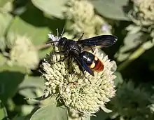 Scolia dubia, also known as the two-spotted scoliid wasp or a blue-winged scoliid wasp, is a 2.0–2.5-centimeter (0.8–1.0 in) long wasp that ranges from New England to Florida and west to the Rocky Mountains in North America.[1] The head, thorax, and first two abdominal segments are black, while the remainder of the abdomen is red with two bright yellow spots on the third abdominal segment. The distal section of the blue-black wings has longitudinal wrinkles. These wasps collect nectar from flowers in late summer and early fall.[2]