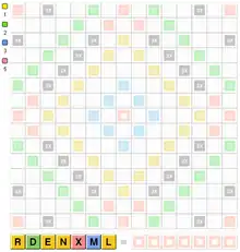 This game is a cross between Othello and Scrabble played on a 13 x13 board. Each player has different coloured tiles. The rack is common and always contains 7 tiles. All tiles have the same value, one point. Points are scored for how many tiles are currently your own colour. The special squares are pink and orange. A word with a tile on a pink square clears the board. When this happens a bonus point is received for each tile you placed on an orange square on that board.[18]