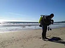 - Surf and beach entries: These entries are complicated by breaking waves. A small break is not usually a problem, but a wave with sufficient energy to knock the diver over is usually best avoided by going under it, if it cannot be avoided, and there is a safe limit which will differ between divers, and vary depending on the equipment used. Going under the break requires the mask and fins to be fitted and the diver should be breathing through the regulator. It is easier to walk backwards through the broken wave if the fins are fitted, and the type and height of break can be important. A plunging breaker is much more difficult and dangerous than a spilling breaker for both entries and exits.