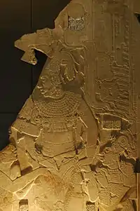 From the many subsequent periods before the ascendency of the Neo-Assyrian Empire in the 10th century BCE Mesopotamian art survives in a number of forms: cylinder seals, relatively small figures in the round, and reliefs of various sizes, including cheap plaques of moulded pottery for the home, some religious and some apparently not.[30] The Burney Relief is an unusually elaborate and relatively large (20 x 15 inches, 50 x 37 cm) terracotta plaque of a naked winged goddess with the feet of a bird of prey, and attendant owls and lions. It comes from the 18th or 19th centuries BCE, and may also be moulded.[31] Stone stelae, votive offerings, or ones probably commemorating victories and showing feasts, are also found from temples, which unlike more official ones lack inscriptions that would explain them;[32] the fragmentary Stele of the Vultures is an early example of the inscribed type,[33] and the Assyrian Black Obelisk of Shalmaneser III a large and solid late one.[34]