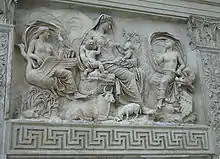 The Romans did not generally attempt to compete with free-standing Greek works of heroic exploits from history or mythology, but from early on produced historical works in relief, culminating in the great Roman triumphal columns with continuous narrative reliefs winding around them, of which those commemorating Trajan (CE 113) and Marcus Aurelius (by 193) survive in Rome, where the Ara Pacis ("Altar of Peace", 13 BCE) represents the official Greco-Roman style at its most classical and refined. Among other major examples are the earlier re-used reliefs on the Arch of Constantine and the base of the Column of Antoninus Pius (161),[60] Campana reliefs were cheaper pottery versions of marble reliefs and the taste for relief was from the imperial period expanded to the sarcophagus. All forms of luxury small sculpture continued to be patronized, and quality could be extremely high, as in the silver Warren Cup, glass Lycurgus Cup, and large cameos like the Gemma Augustea, Gonzaga Cameo and the "Great Cameo of France".[61] For a much wider section of the population, moulded relief decoration of pottery vessels and small figurines were produced in great quantity and often considerable quality.[62]