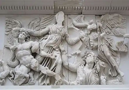 The Hellenistic period is conventionally dated from the death of Alexander the Great in 323 BCE, and ending either with the final conquest of the Greek heartlands by Rome in 146 BCE or with the final defeat of the last remaining successor-state to Alexander's empire after the Battle of Actium in 31 BCE, which also marks the end of Republican Rome.[51] It is thus much longer than the previous periods, and includes at least two major phases: a "Pergamene" style of experimentation, exuberance and some sentimentality and vulgarity, and in the 2nd century BCE a classicising return to a more austere simplicity and elegance; beyond such generalizations dating is typically very uncertain, especially when only later copies are known, as is usually the case. The initial Pergamene style was not especially associated with Pergamon, from which it takes its name, but the very wealthy kings of that state were among the first to collect and also copy Classical sculpture, and also commissioned much new work, including the famous Pergamon Altar whose sculpture is now mostly in Berlin and which exemplifies the new style, as do the Mausoleum at Halicarnassus (another of the Seven Wonders), the famous Laocoön and his Sons in the Vatican Museums, a late example, and the bronze original of The Dying Gaul (illustrated at top), which we know was part of a group actually commissioned for Pergamon in about 228 BCE, from which the Ludovisi Gaul was also a copy. The group called the Farnese Bull, possibly a 2nd-century marble original, is still larger and more complex,[52]