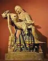 Hellenistic sculpture greatly expanded the range of subjects represented, partly as a result of greater general prosperity, and the emergence of a very wealthy class who had large houses decorated with sculpture, although we know that some examples of subjects that seem best suited to the home, such as children with animals, were in fact placed in temples or other public places. For a much more popular home decoration market there were Tanagra figurines, and those from other centres where small pottery figures were produced on an industrial scale, some religious but others showing animals and elegantly dressed ladies. Sculptors became more technically skilled in representing facial expressions conveying a wide variety of emotions and the portraiture of individuals, as well representing different ages and races. The reliefs from the Mausoleum are rather atypical in that respect; most work was free-standing, and group compositions with several figures to be seen in the round, like the Laocoon and the Pergamon group celebrating victory over the Gauls became popular, having been rare before. The Barberini Faun, showing a satyr sprawled asleep, presumably after drink, is an example of the moral relaxation of the period, and the readiness to create large and expensive sculptures of subjects that fall short of the heroic.[53]
