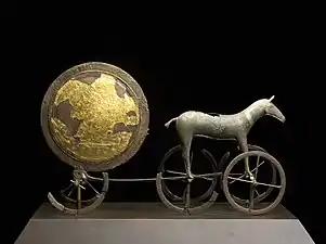 The Trundholm sun chariot, perhaps 1800–1500 BCE; this side is gilded, the other is "dark".