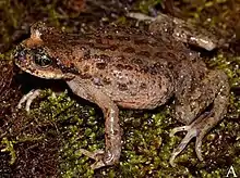 Adult males measure 51–56 mm (2.0–2.2 in) and adult females 54–57 mm (2.1–2.2 in) in snout–vent length.[1][3] The body is slightly compressed and the head is large. The snout is rounded. Tympanum is totally absent, but the supratympanic fold is distinct. The forelimbs are long whereas the hindlimbs are moderately short. The finger and the toe tips are rounded; the toes have rudimentary webbing. Skin is dorsally very rough and largely covered with tubercles, many of them bearing black spines. Ventral skin is mostly smooth. The upper surfaces are dark brownish gray; the flanks are light brown. There is a triangular pattern on the head, and the sides are of the head are dark brown. The upper lip is creamy white with irregular brown mottling. Ventral surfaces are uniform light yellow.[1]
